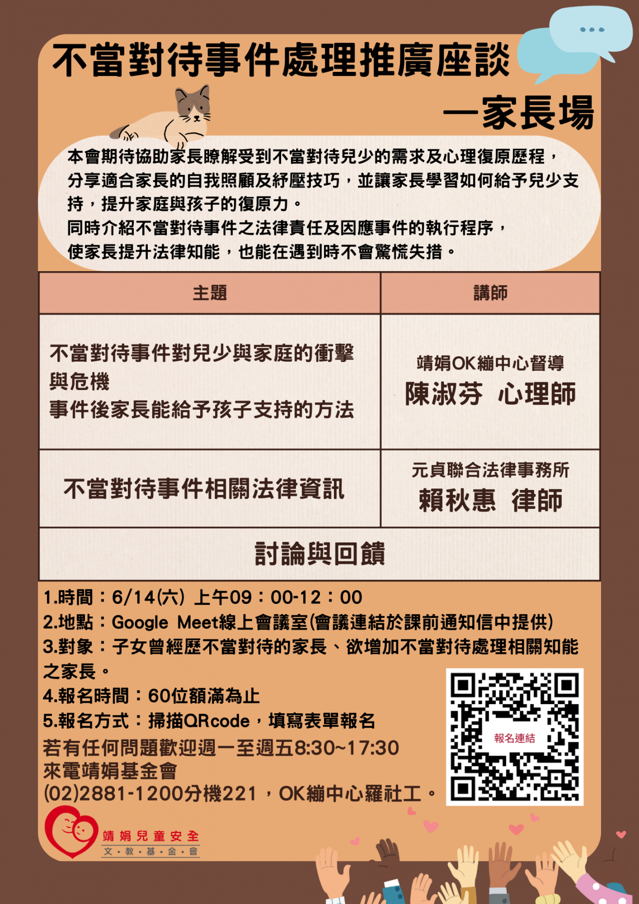 函轉財團法人靖娟兒童安全文教基金會OK繃兒童服務中心擬於114年6月14日辦理「不當對待事件處理推廣座談—家長場」